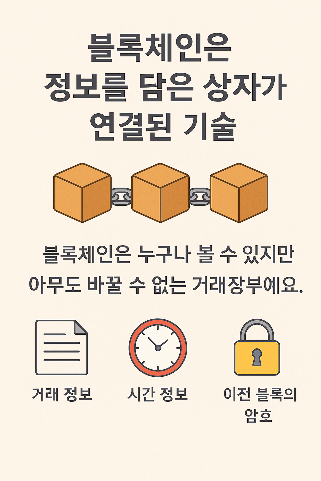 “블록체인은 모든 거래를 투명하게 기록하는 디지털 장부예요.”